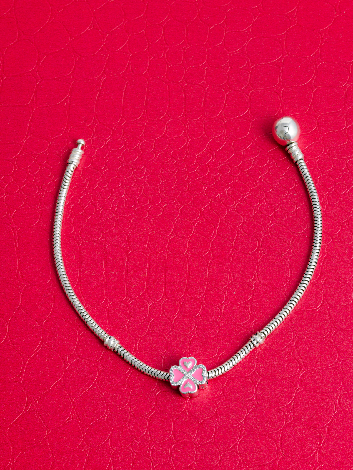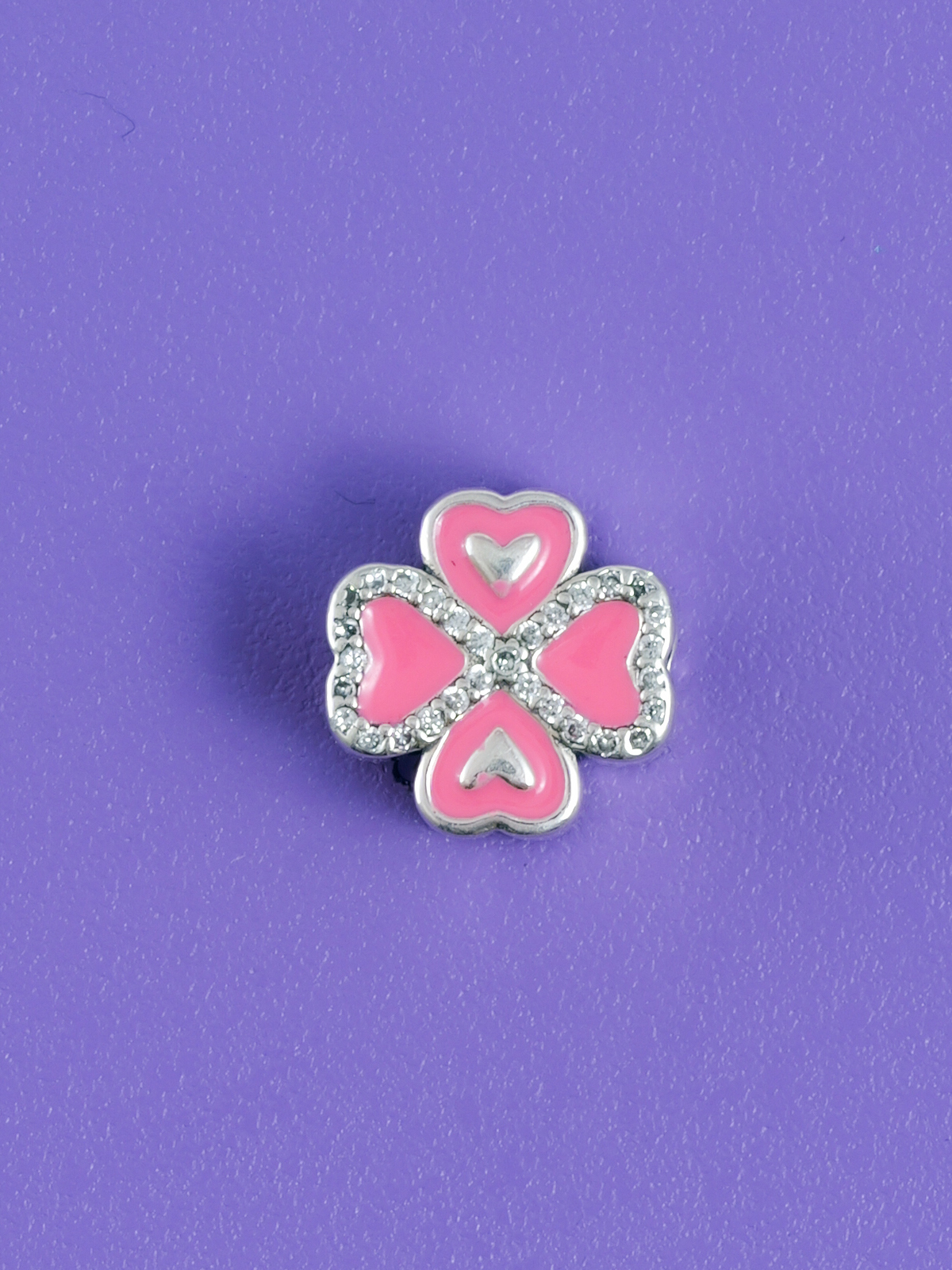 Přívěsek na náramek s příběhem ve tvaru čtyřlístku s nekonečnem a srdíčky. Vše v růžové glazuře.