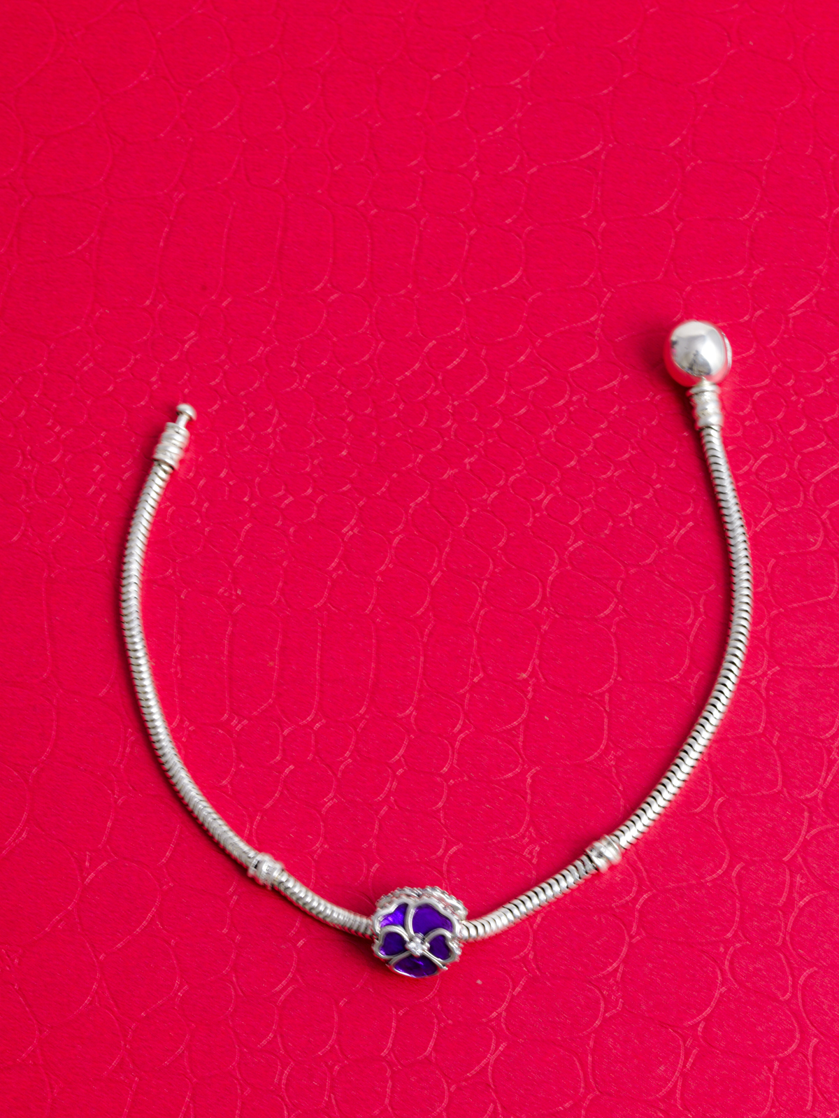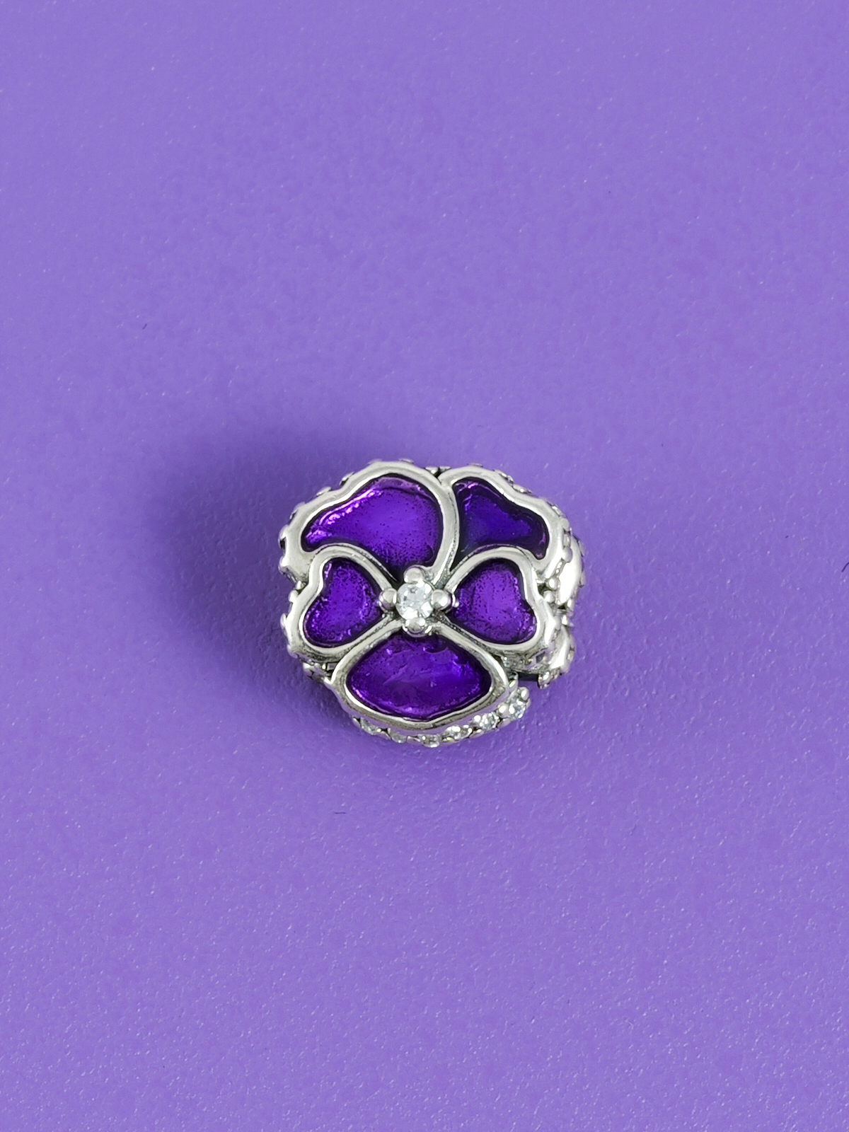 Přívěsek na náramek s příběhem ve tvaru nádherné fialové macešky zdobené glazurou.