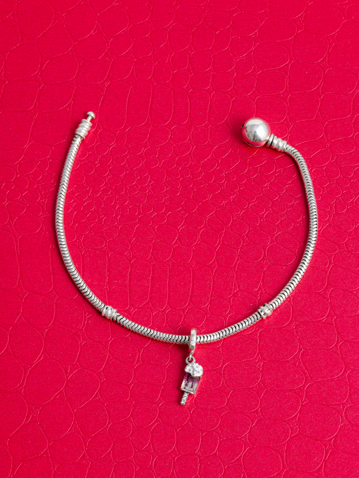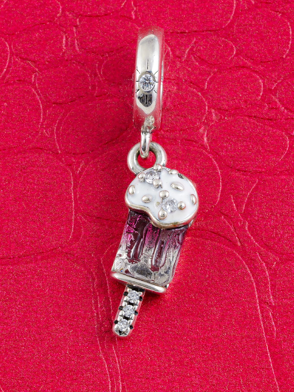 Přívěsek na náramek s příběhem ve tvaru růžového nanuku s polevou z bílé glazury.