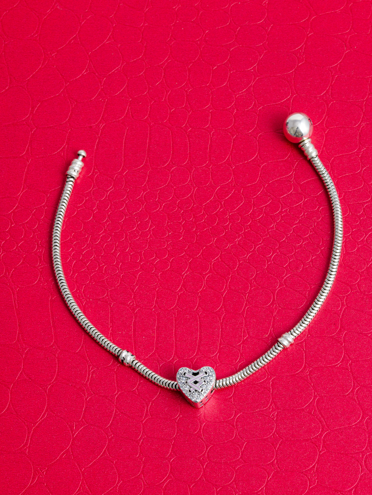 Přívěsek na náramek s příběhem ve tvaru srdce se šněrováním v jemné růžové barvě. Přívěsek z nich je osázen třpytivými kameny. Odvážnější kousek pro každou ženu.