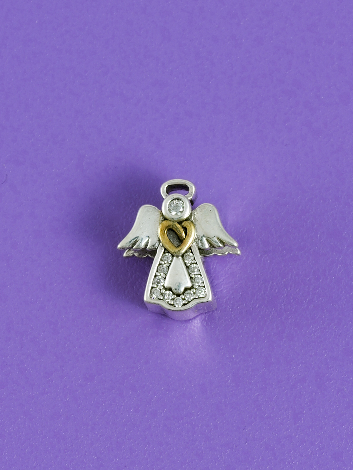 Přívěsek na náramek s příběhem ve tvaru nádherného svatého anděla se zlatým srdcem a svatozáří.