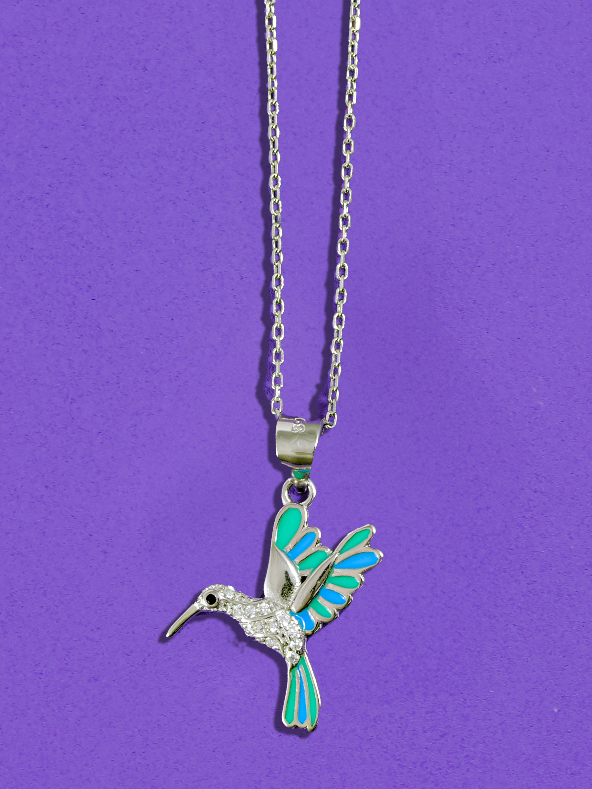 Přívěsek ve tvaru nádherného kolibříka v letu. Kolibřík je symbol štěstí, harmonie a optimismu. Říká se, že přináší lásku a léčení. Přívěsek je osázen zirkony a barevná křídla zajišťuje vydařená glazura.